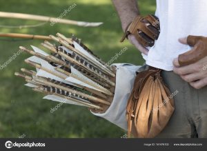 Archer with medieval English longbow and arrows. Sport and recreation concept.
